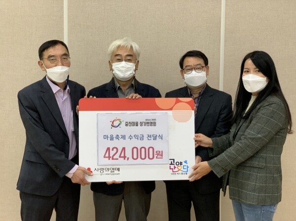 중산1동 마을축제추진위원회는 지난 마을축제 기간 중 발생한 수익금 846,600원을 새마을 부녀회 사랑의 김장김치 나눔 행사에 기부하고 지역사회보장협의체에 140,000원을 지정 기탁했다.