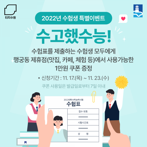 올해 수능을 치른 수험생이 11월 17일부터 23일까지 ‘터치수원 이벤트 구글폼’에 접속한 후 수험표를 등록해 이벤트에 참여하면 12시간 안에 쿠폰코드가 적힌 문자메시지를 받을 수 있다.