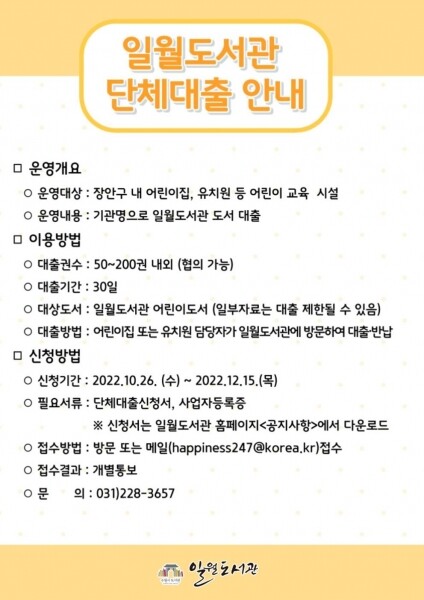 단체대출신청서와 사업자등록증을 지참하고 12월 15일까지 일월도서관을 방문하거나 전자우편으로 제출해야 한다.