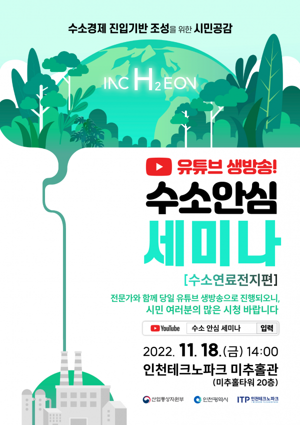 이날 수소안심세미나는 인천시 수소생태계 전략 중 ‘수소연료전지’에 대해 한국에너지공단, 한국에너지기술연구원, 한국가스안전공사 등 국가 에너지 전문기관과 학계, 산업계, 시민단체, 시민들이 직접 참여한다.