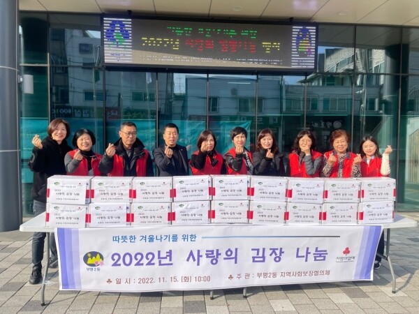 박금숙 부평2동 지역사회보장협의체 위원장은 “추운 겨울에 사랑의 김장 김치가 작지만 따뜻한 도움이 되길 바란다”며 “앞으로도 도움이 필요한 이웃을 위해 봉사하겠다”고 말했다.