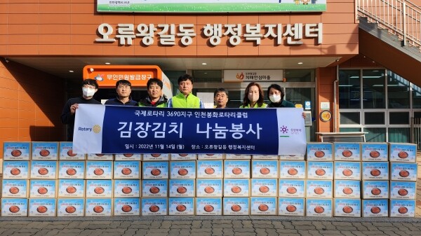 이광훈 인천봉화 로타리클럽 회장은 “어려운 이웃들이 추운 겨울을 건강하게 보내길 바라는 마음으로 김장김치 나눔 행사를 하게 됐다”며 “앞으로도 우리의 손길이 필요한 곳을 찾아 더욱 열심히 봉사하겠다”고 말했다.