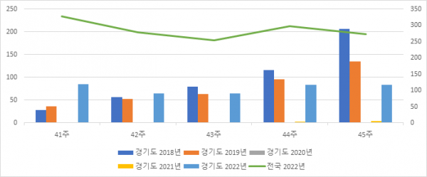 2018년과 2019년 동일 기간 신고 건수는 각각 486건, 384건으로 올해보다 신고가 많았으나 2020년 0건, 2021년 8건으로 코로나19 감염증으로 인해 감소했던 신고율이 다시 상승세라 관리가 필요하다.