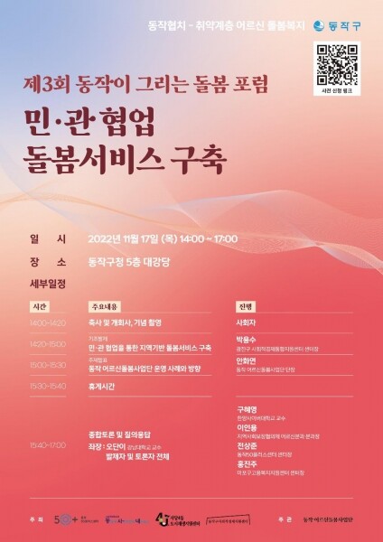 박일하 동작구청장은 “이번 행사가 어르신 돌봄서비스의 방향성에 대해 토론하고 좋은 의견을 청취하는 자리가 되길 바란다”며 “도움이 필요한 어르신이 알맞은 서비스를 지원받을 수 있도록 촘촘한 돌봄서비스를 구축하겠다”고 말했다.