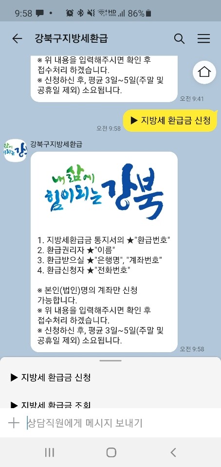 먼저 ‘강북구지방세환급’ 카카오톡 채널에서 환급금을 신청 및 조회할 수 있으며 환급 담당자의 자세한 상담도 받아볼 수 있다.