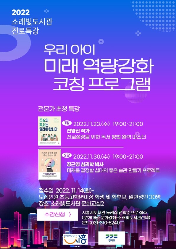 소래빛도서관 관계자는 “이번 강연은 독서를 어려워하는 아이에게 책을 좋아할 수 있게 하는 독서 방법을 지도하고 아주 작은 습관의 힘이 청소년의 삶을 변화시킬 수 있다는 것을 알려주는 좋은 기회가 될 것”이라고 밝혔다.