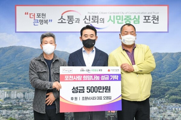 [뉴스서울] 포천시는 지난 11일 초원낚시터 오영길 대표가 경기사회복지공동모금회를 통해 이웃돕기 성금 500만원을 기탁했다고 밝혔다.