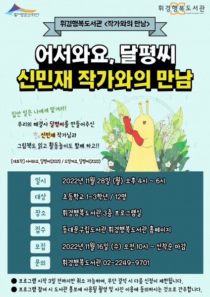 신민재 작가와의 만남은 동대문구립도서관 휘경행복도서관 누리집에서 신청할 수 있으며 선착순으로 12명을 모집한다.