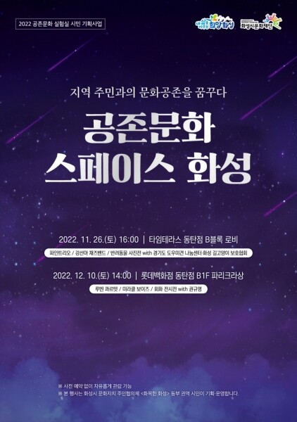 동부 권역에서는 지역 주민과의 문화공존을 꿈꾸는 ‘공존문화 스페이스 화성’을 기획해 11월 26일과 12월 10일 양일간 동탄 타임테라스와 롯데백화점 동탄점에서 지역 공연단체의 버스킹 무대와 함께 지역작가 회화작품 전시전 등을 준비했다.