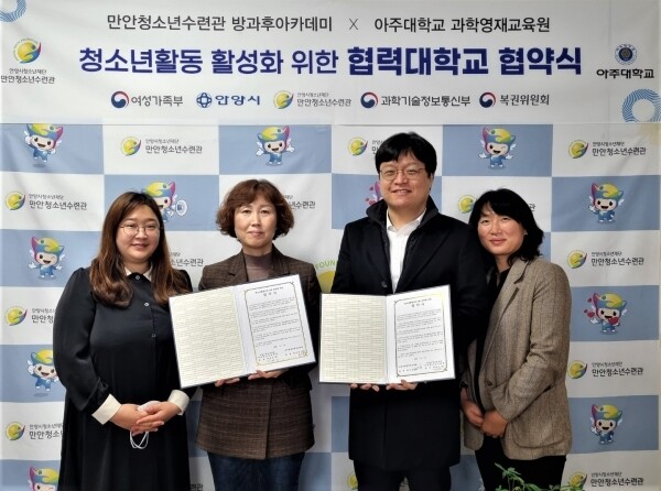 이번 협약은 청소년들의 역량을 최대한 계발할 수 있는 교육 기회를 제공해 전인적 과학인재를 양성하는데 기여하고 있는 아주대학교 과학영재교육원이 만안청소년수련관 방과후아카데미 청소년들에게 적합한 프로그램을 제공하는 것을 목적으로 진행됐다.