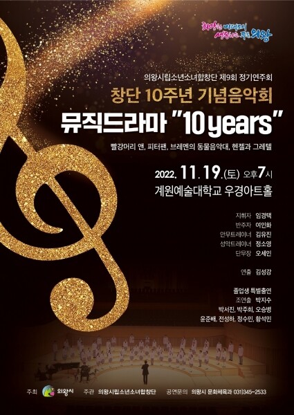 의왕시립소년소녀합창단의 창단 10주년을 맞이해 열리는 이번 음악회는 합창단 출신의 졸업생과 현 단원이 지난 10년의 순간들을 되새기고 앞으로 더 발전할 합창단의 모습을 그리며 단원들 스스로 기획·제작한 작품이다.
