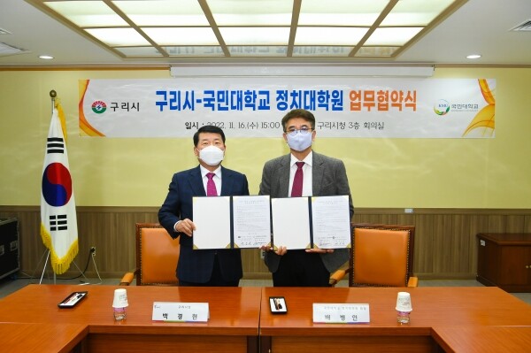 시와 국민대학교 정치대학원은 관학 협력의 일환으로 직무능력 향상을 위한 석사학위 과정 전문교육, 상호 현안 및 시책에 대한 자문 협조 등 상호교류, 구리시청 재직자에 대한 수업료 감면을 주요 골자로 협약을 체결했다.