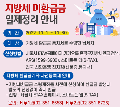 김미경 은평구청장은 “잠들어 있는 지방세 환급금을 납세자에게 신속히 돌아갈 수 있도록 적극 홍보하겠다”며 “앞으로도 납세자 권익 보호와 신뢰 세무행정을 구현하는 데 최선을 다하겠다”고 말했다.