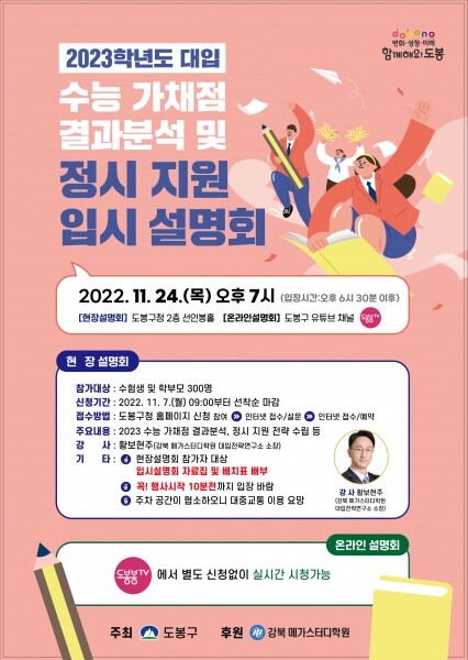 입시설명회는 도봉구 거주 또는 학교에 재학 중인 수험생과 학부모를 대상으로 이번 대입 수학능력시험의 가채점 결과분석과 정시지원 전략에 도움이 될 수 있는 설명회로 진행된다.