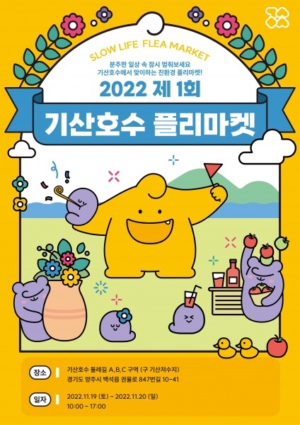 기산호수관광특구상인회가 주최하는 ‘기산호수 플리마켓’은 기산호수 주변에 조성된 둘레길 완공을 기념하고 다양한 경제주체가 참여해 기산리 주변상권을 활성화하고 상인들의 자생력을 키우기 위한 것으로 2022년 우수골목상권 육성사업 공모에 선정돼 추진된다.