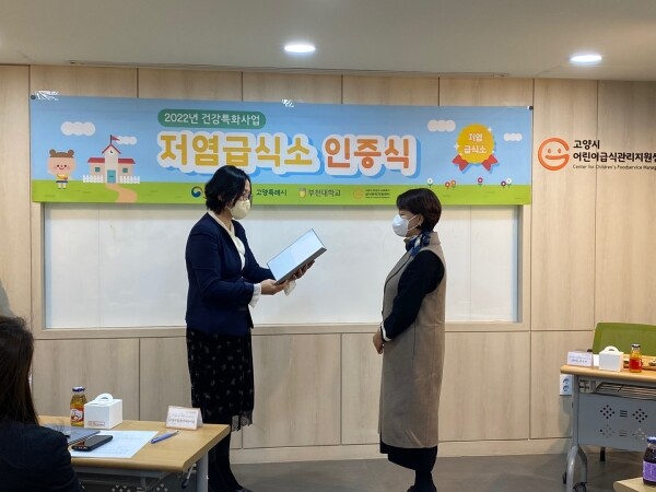 센터는 위 과정을 모두 수료한 어린이 급식소에 고양시장 명의의 인증서와 저염 급식 현판을 전달하고 이 중 최우수 기관을 선정해 상장 수여 및 축하 상품을 전달했다.