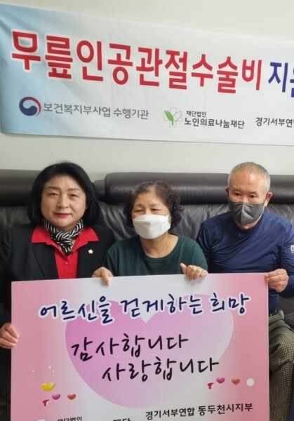 이에 노인의료나눔재단 동두천시지부에서는 경제적인 부담과 수술에 대한 인지 부족, 두려움 등으로 인해 제때 치료를 받지 못하는 취약계층 노인들에게 무릎인공관절수술을 지원함으로써 경제적 혜택은 물론 사회적 자립을 도와 100세 시대 노인 건강지킴이 역할을 톡톡히 하고 있다는 평가를 받고 있다.