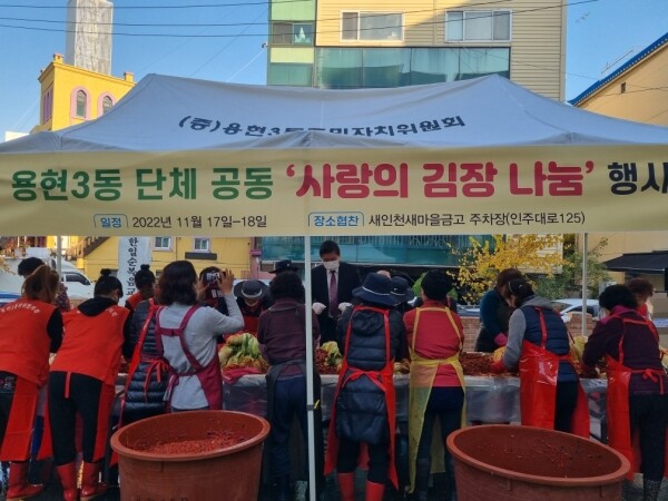 한편 용현3동 행정복지센터는 지난 17일과 18일 용현3동 새인천새마을금고 주차장에서 사랑의 김장김치 나눔 행사를 진행하고 직접 담근 김장김치 250포기를 저소득 홀몸노인 등 취약계층 250세대에 전달했다.