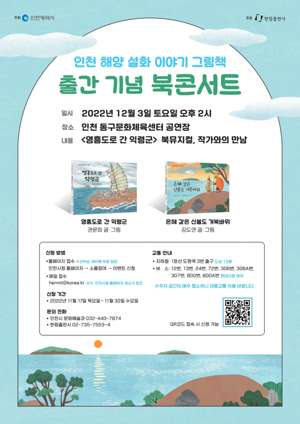 인천광역시는 오는 12월 3일 동구문화체육센터에서 시민, 학생 등이 참석한 가운데, ‘2022 인천 해양 설화 이야기 그림책 출간 기념 북콘서트’를 개최한다고 밝혔다.