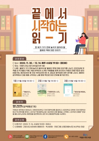 [뉴스서울] 고양특례시 아람누리도서관이 독서문화프로그램 ‘끝에서 시작하는 읽기’를 오는 11월 30일부터 12월 14일까지 매주 수요일 저녁 7시 30분, 3차시에 걸쳐 운영한다.