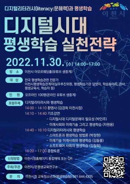 시 관계자는 디지털시대, 미래기술의 다양한 이야기를 함께 공유하는 실질적인 평생학습 토론회인만큼 전국 평생학습관련 전문가 및 관계자, 이천시 평생학습실무추진위원, 읍·면·동 주민자치회 및 평생교육사, 이천시 평생학습관계자들이 관심을 갖고 참여할 것으로 기대된다고 밝혔다.