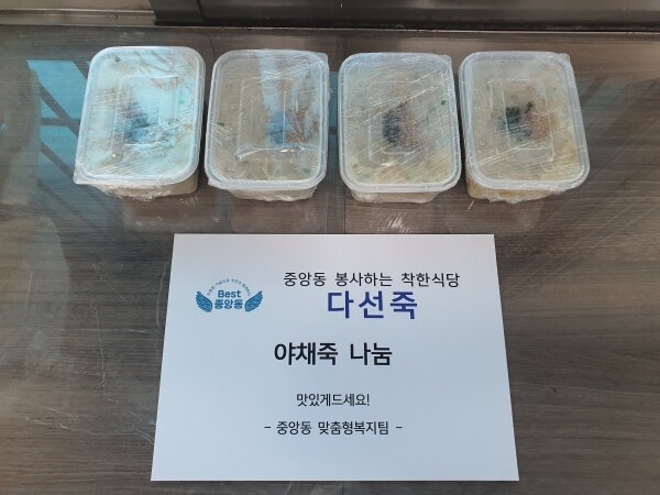 이날 오후 다선죽을 운영하고 있는 이경숙 대표가 치아 건강 악화로 인해 음식물 섭취에 어려움을 겪고 있는 독거노인 가구에 전달해달라며 직접 만든 죽을 중앙동 행정복지센터에 기탁했다.