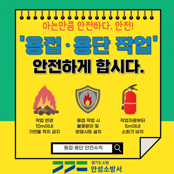 ?공사장 화재 예방 안전수칙은 용접 등 화기 취급 작업 시 화재감시자 지정 배치 화기 취급 시 5m 이내 소화기 비치 화기 취급 작업 후 일정시간 불티 비산 감시 용접작업 주변 최소 15m 이상 안전거리 확보 및 가연물 제거 등이 있다.