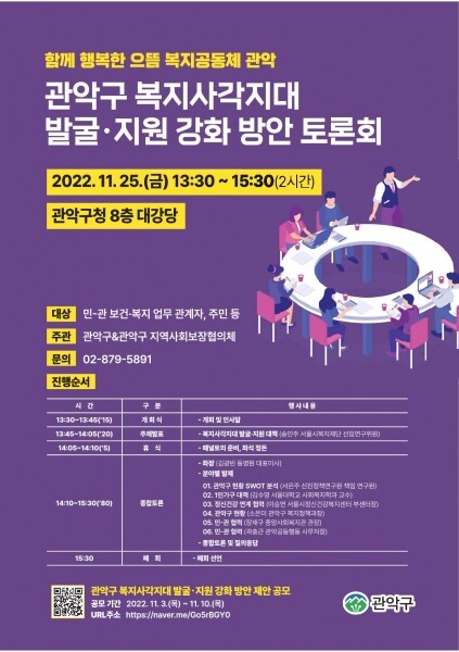 ‘관악구 복지사각지대 발굴·지원 강화 방안 토론회’는 별도의 참가 신청 없이 민·관 복지 업무 관계자, 주민 등 관심 있는 누구나 참여 가능하다.