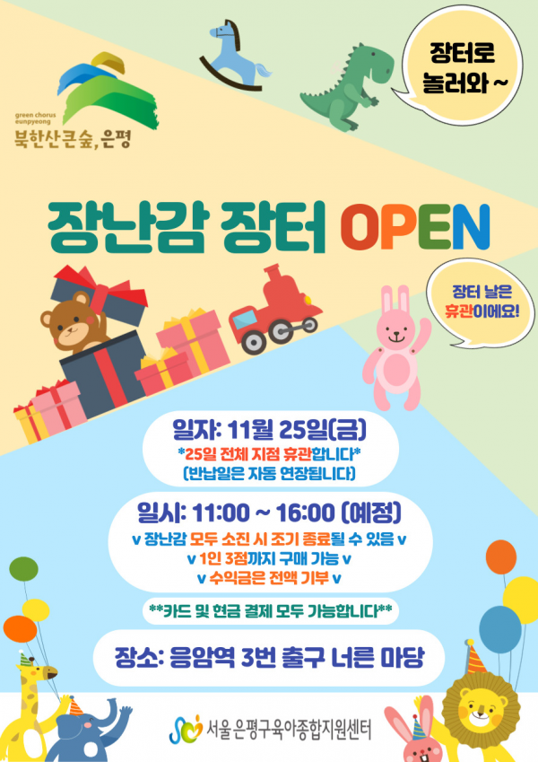 은평구가 운영하는 장난감나라 5곳에서 보유한 5년 이상 된 중고 장난감을 판매하고 수익금 전액은 모두 ‘따뜻한 겨울나기’ 성금으로 기부하는 나눔 행사다.