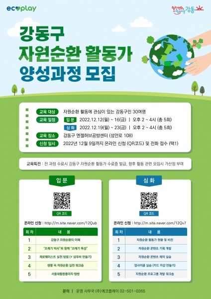 입문반, 심화반 각각 30명씩 모집하며 자원순환에 관심이 많고 적극적으로 참여 할 수 있는 강동구민이면 누구나 신청 가능하다.