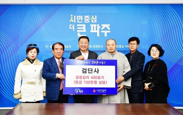 김경일 파주시장은 “김장 한 포기 한 포기에 담긴 온정으로 더불어 사는 지역 공동체를 만드는 데 앞장서주셔서 감사드리며 이 외에도 지속적으로 나눔 봉사를 실천해주신 검단사에 감사드린다”고 전했다.