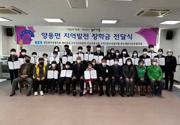 이날 행사는 양동면 이장협의회, 주민자치위원회, 새마을회. 지역사회보장협의체, 적십자봉사회, 바르게살기운동협의회 등 6개 단체가 참여해 청소년들의 올바른 성장과 꿈을 응원하고 경제적 부담을 덜어주고자 진행되어 관내 초·중·고 모범학생 22명에게 총 540만원의 장학금이 전달됐다.