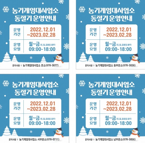 이창희 친환경기술과장은 “이번 농한기 운영시간 변경을 통해 장비 점검 및 시설물 보수를 진행해 더 나은 서비스를 제공하겠다”며 “앞으로도 불편함 없이 농기계를 임대할 수 있도록 노력하겠다”고 말했다.