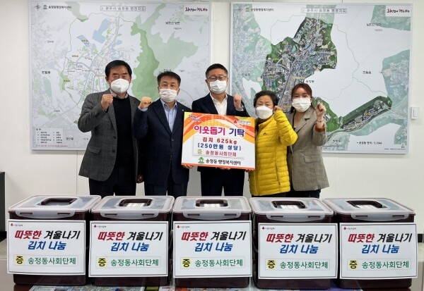 이날 기탁식에서는 송정동 통장협의회·새마을협의회·주민자치위원회, 경제인연합회가 김치 625㎏을 기탁했으며 송정동 지역사회보장협의체는 특화사업의 일환으로 보관용 밀폐용기를 준비해 훈훈함을 더했다.