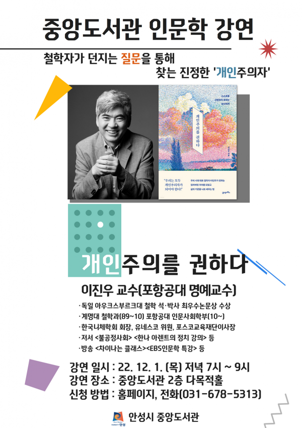 공정자 안성시 도서관과장은 “개인주의를 주제로 하는 이번 강연을 안성시민 여러분들이 ‘진정한 나다움’을 실현할 수 있는 좋은 기회로 삼으시길 바란다”고 말했다.