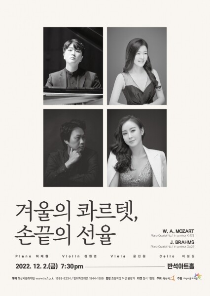이번 공연에서는 현재 한양대학교 음악대학에서 교수로 재직하며 진정성 있는 울림으로 청중을 매료시키는 피아니스트 허재원과 섬세한 연주와 다양한 무대 활동을 통해 청중과의 만남을 이어가고 있는 현 대구시향 악장 바이올리니스트 정원영, 감성적 연주를 선보이며 경희대학교 교수로 후학 양성에 힘쓰고 있는 비올리스트 윤진원 그리고 문화체육관광부 장관상 수상 및 서울시향 부수석을 역임한 첼리스트 이정란이 함께 출연해 더욱 깊이 있는 연주를 선보일 예정이다.