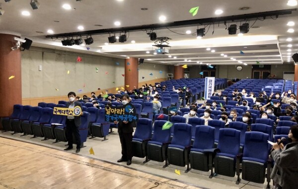 경기국제공항 화성유치위원회에서는 지난 21일 평택시 국제대학교 항공정비기술학과 학생 80여명을 대상으로 국제관 강당에서 ‘경기국제공항’ 관련 설명회를 진행하고 학과생들과 함께 ‘경기국제공항’ 유치를 기원하는 오색종이비행기 날리기 퍼포먼스를 실시했다.
