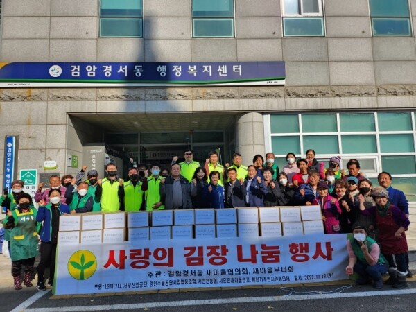 이미숙 검암경서동장은 “이웃을 위해 온정을 베풀어주신 검암경서동 단체원들에게 감사드리고 함께 이웃사랑을 실천할 수 있어서 기쁘다”며 “오늘 담근 김치에 많은 분의 정성이 담긴 만큼 우리 이웃들이 따뜻한 겨울을 보낼 수 있길 바란다”고 전했다.
