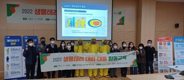 이에 생물 테러 모의 훈련은 생물테러 대응 초동 조치를 주제로 생물테러 모의 상황 대응체계 교육, 초동대응요원 개인 보호구 착·탈의 실습, 다중탐지키트 시연 등 실제 상황에서 적용할 수 있는 내용으로 진행됐다.
