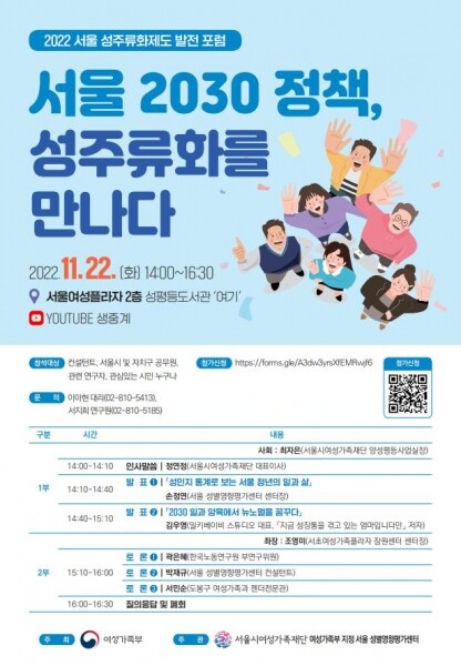 11월 22일 오후 2시, 대방동 서울여성플라자 성평등도서관 ‘여기’에서 개최하는 ‘서울 2030 정책, 성주류화를 만나다’를 주제로 성주류화 제도 발전 포럼을 개최한다.
