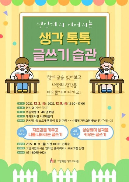 프로그램은 12월 2일‘자존감을 키우고 나를 나타내는 글쓰기’12월 9일‘상상하며 생각을 키우는 글쓰기’ 순서로 진행된다.