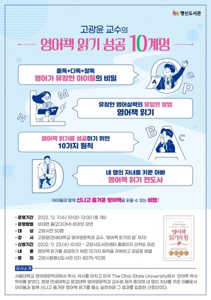 행신도서관 문화행사 담당자는“영어는 자녀를 키우는 양육자에게 풀리지 않는 숙제와 같이 받아들여진다 네 자녀를 키우며 영어책 읽기를 몸소 실천한 고광윤 교수의 강연은 양육자들이 가정에서 실천할 수 있는 영어책 읽기 방법과 자녀 교육에 대한 궁금증을 해소할 수 있는 기회가 될 것”이라고 말했다.