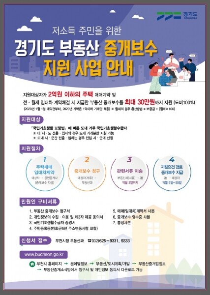 중개보수 지원을 원하는 대상 시민은 부동산 중개보수 청구서 매매계약서 국민기초생활보장 수급자 증명서 주민등록등본, 개인정보 수집·이용 및 제삼자 제공 동의서 중개보수 영수증과 통장 사본 등을 가지고 부천시청 부동산 과로 방문하면 된다.