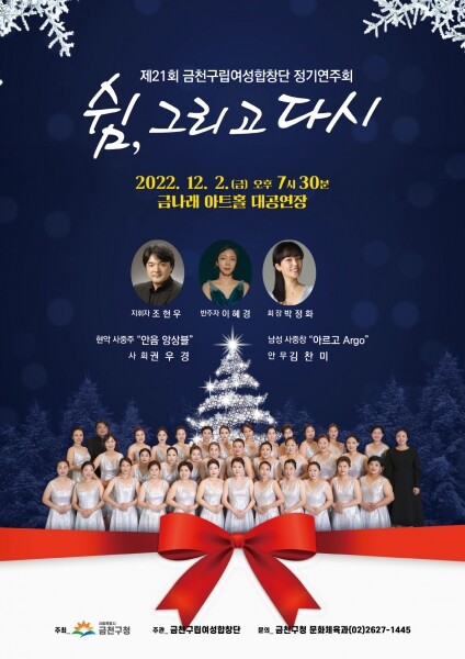 유성훈 금천구청장은 “문화도시 금천을 위해 헌신적으로 봉사하는 구립 여성합창단의 모든 임원 및 단원분들께 존경과 감사를 표한다”며 “구민들께서는 겨울밤 가족 또는 가까운 분들과 같이 오셔서 아름다운 음악과 함께 행복한 시간을 보내시길 바란다”고 말했다.