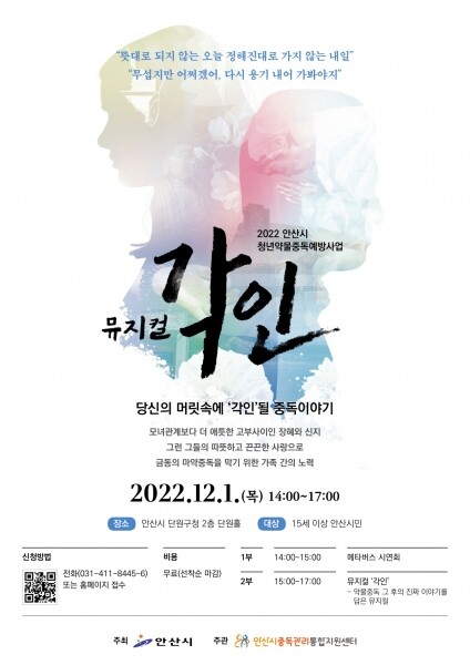 15세 이상 안산시민 누구나 선착순 200명까지 무료관람할 수 있으며 공연 안내는 중독관리통합지원센터 누리집에서 확인하거나 전화로 문의하면 된다.