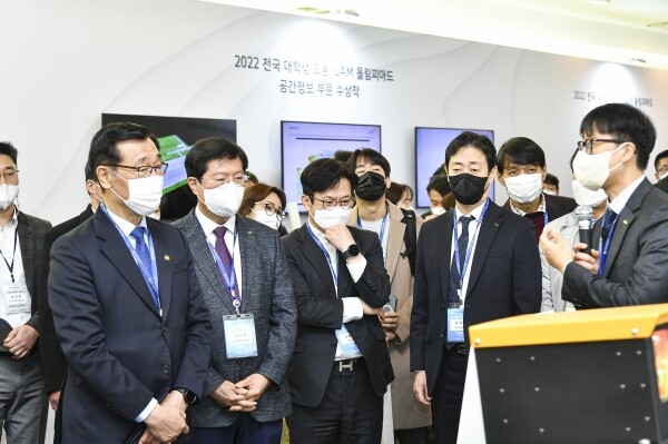 ‘사진설명’ 사진3. 김병수 김포시장이 ‘2022 UAM 비행시연 행사’에 참석해 UAM 관련 수상작 관련 설명을 관계자로부터 듣고 있다.