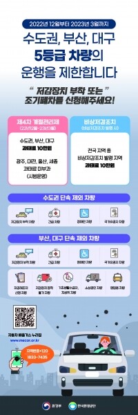 그 중 수송부문 주요대책인 저감장치 미부착 배출가스 5등급 차량 운행제한이 토·일요일과 공휴일을 제외한 평일 오전 6시부터 오후 9시까지 실시되며 단속에 적발될 경우 1일 10만원의 과태료가 부과된다.