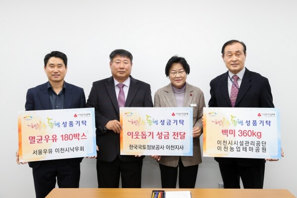 서울우유 이천시낙우회에서 멸균우유 180박스, 이천시시설관리공단 이천농업테마공원에서 백미 360kg, 한국국토정보공사 이천지사에서 이웃돕기 성금을 기탁하며 지난 23일 이천시청에서 기탁식을 가졌다.