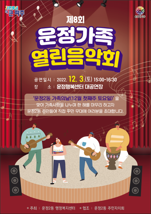 김윤정 운정2동장은 “8회째를 맞는 운정가족 열린음악회가 연말 가족, 친구, 이웃과 함께 추억을 만드는 축제가 되기를 기대한다”며 “운정주민들의 많은 관심과 참여로 소통과 교류의 장이 되었으면 한다”고 말했다.