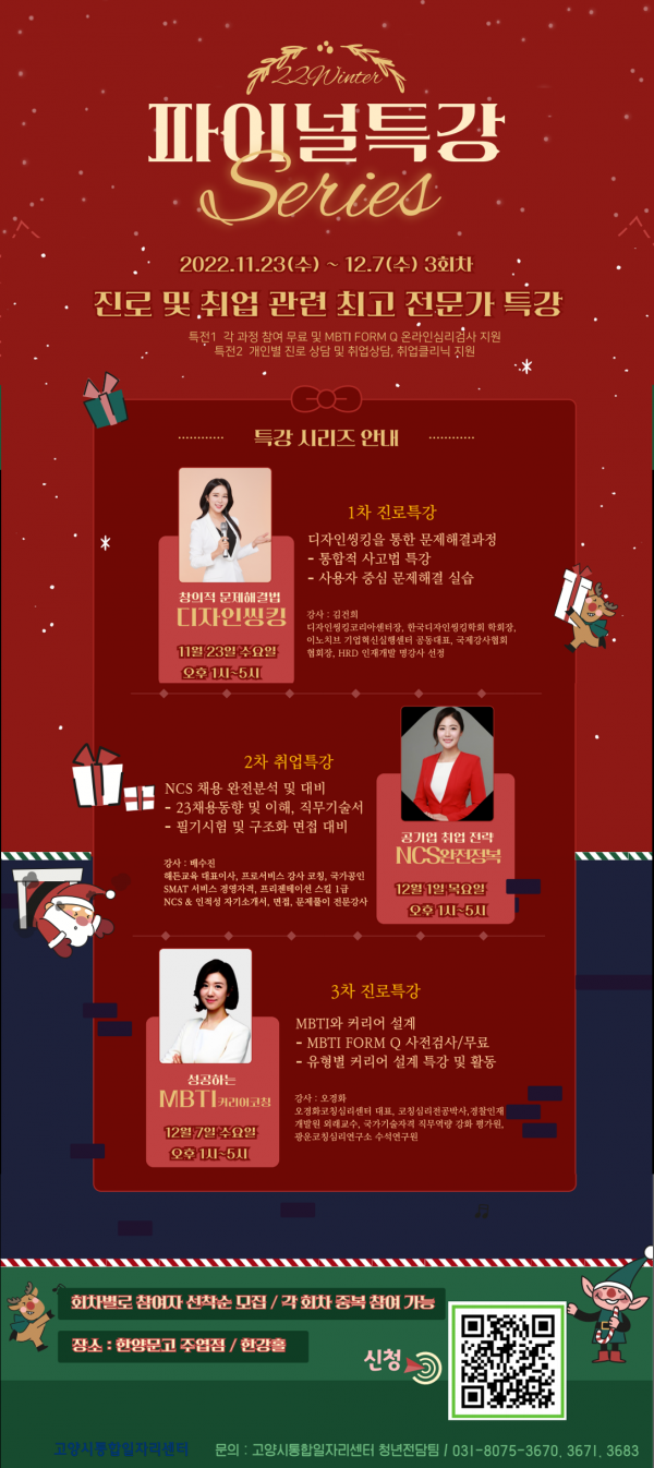 12월 7일 ‘진로탐색을 위한 MBTI 성격유형 분석’은 MBTI 검사의 이해, 유형별 특징 MBTI 성격유형별 진로탐색, 커리어설계 등에 대해 배우고 선호지표 및 유형별 실습 활동을 한다.